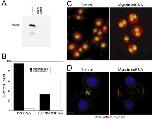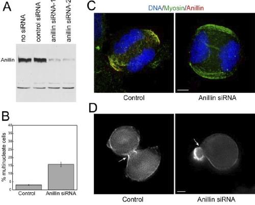 Figure 8. Depletion of anillin by siRNA in HeLa cells. (A) Western blot with anti-anillin of whole cell lysates after treatment with no RNA, control siRNA, or siRNA directed against human anillin. (B) Frequency of multinucleation in control or siRNA-treated HeLa cells. (C) immunofluorescence staining of DNA (blue), anillin (green), and myosin II (red) in HeLa cells treated with control or anillin siRNA. (D) Single frames of YFP- Myosin fluorescence from Movie S4, control, and Movie S8, anillin siRNA. White arrow indicates position of contractile ring. Bars, 5 um. |