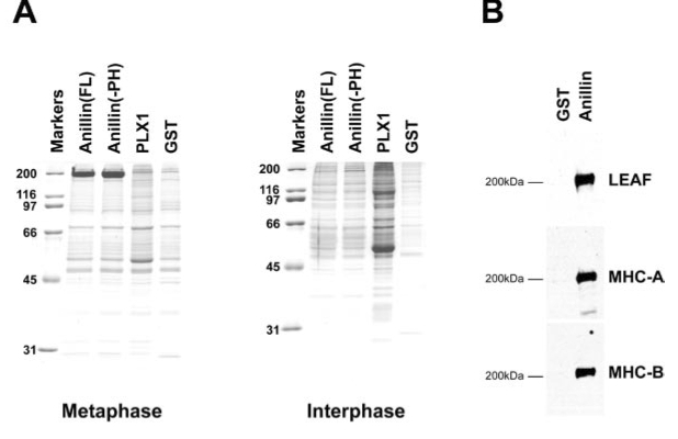 Figure 2. Anillin affinity chromatography. (A) Eluates from anillin (full length [FL] or without pleckstrin ho- mology domain [-PH]), Polo kinase (PLX1), or GST columns. Left, cytostatic factor arrested extracts. Right, interphase extracts. (B) Eluates from GST and full-length anillin columns immunoblotted with antibodies to nonmuscle myosin II heavy chain. |