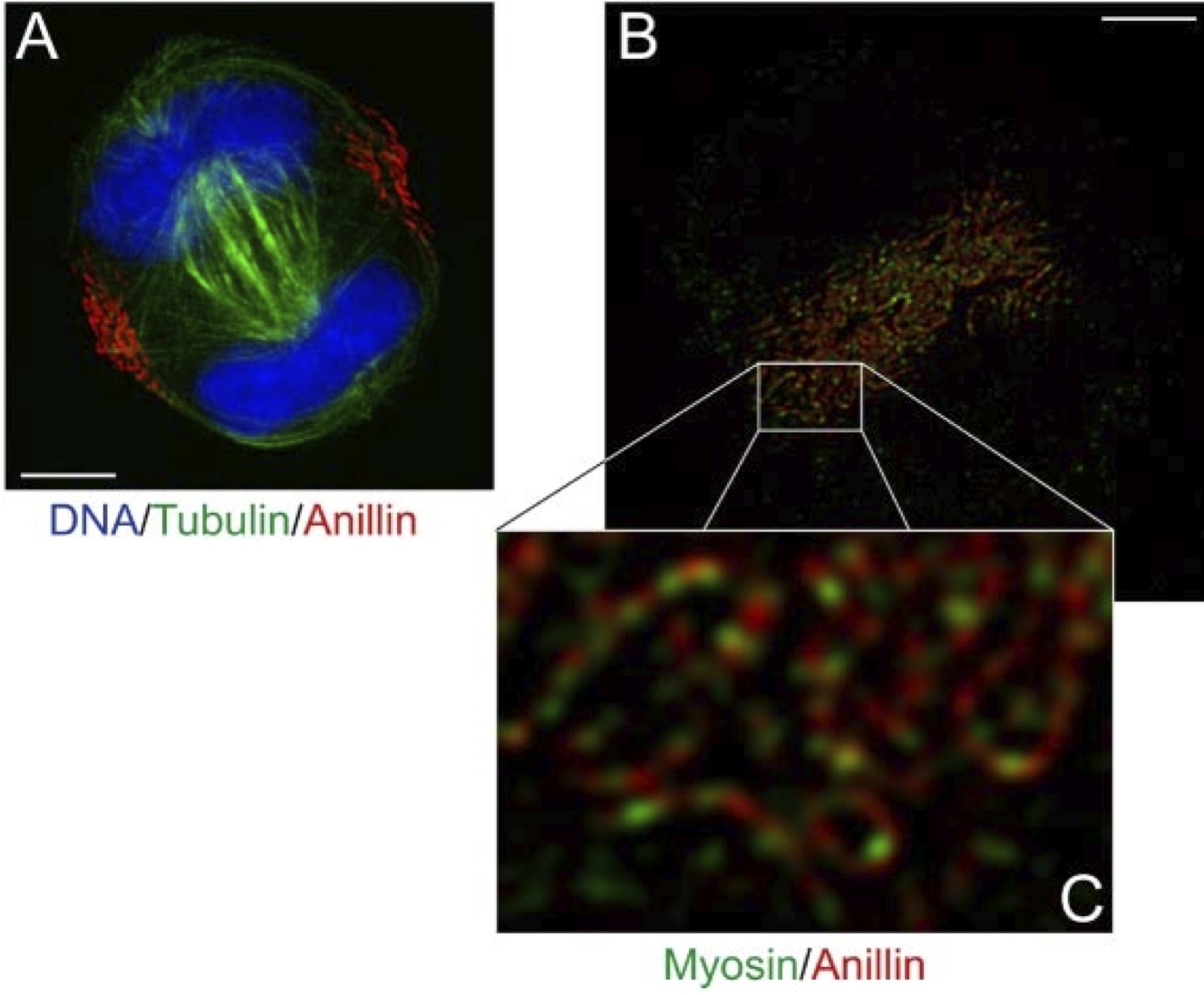 Figure 5. Myosin II and anillin organization in arrested contractile rings. (A) DNA, tubulin, and anillin staining in a blebbistatin-arrested HeLa cell. (B) Image plane at the coverslip surface in a blebbistatin-arrested HeLa cell stained for anillin and myosin II. (C) Enlarged view of B. Bars, 5 um. |