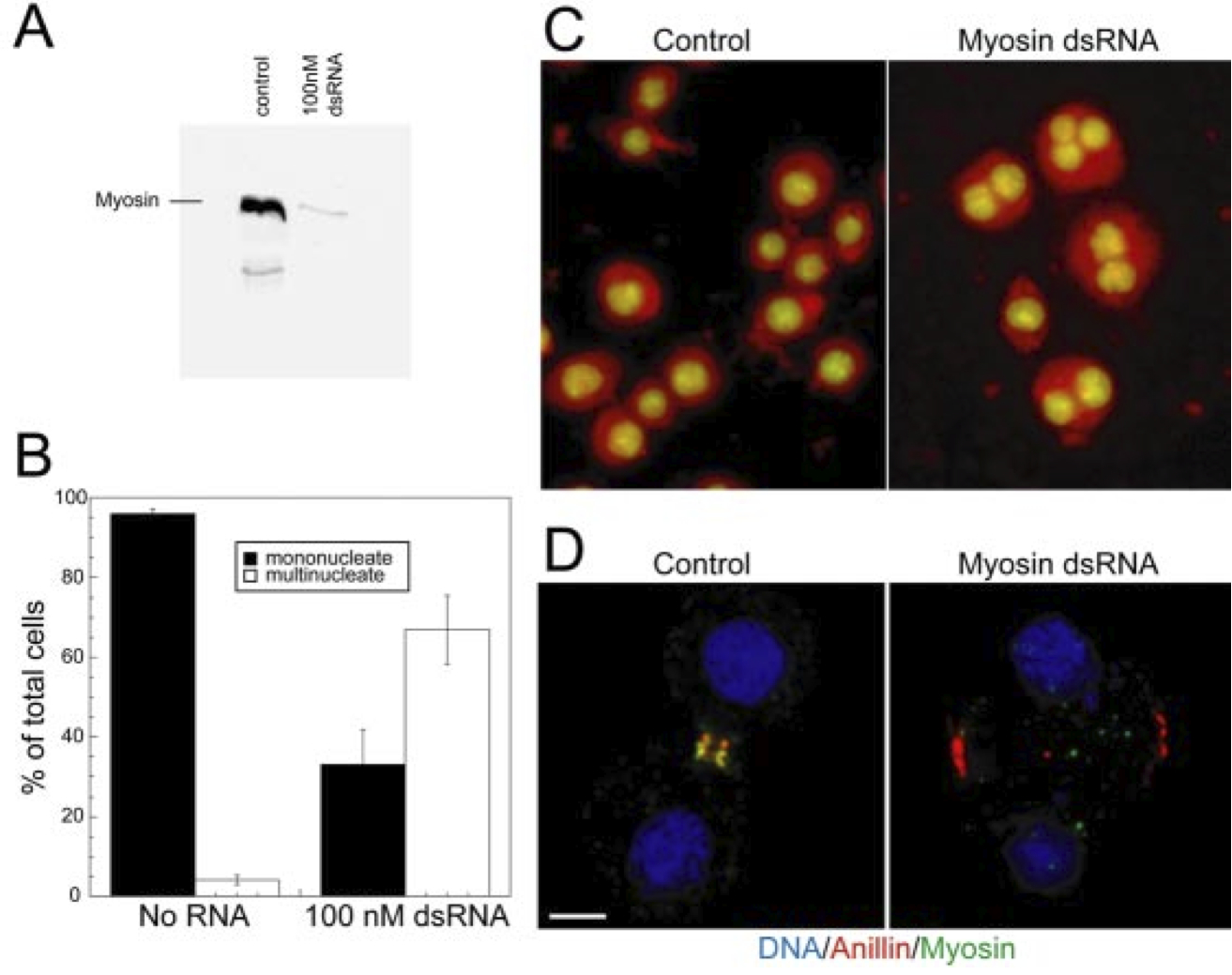 Figure 7. Depletion of myosin II by dsRNA in Drosophila cells. (A) Western blot of myosin II after control and 100 nM myosin II dsRNA treatment. (B) Quantitation of multinucle- ate phenotype in untreated or myosin II dsRNA-treated cells. (C) DNA staining of multinucleate cells in control or myosin II dsRNA-treated cells. (D) Image of control or myosin II dsRNA-treated cells during cytokinesis stained for DNA, anillin, and myosin II. Bar, 5 um. |