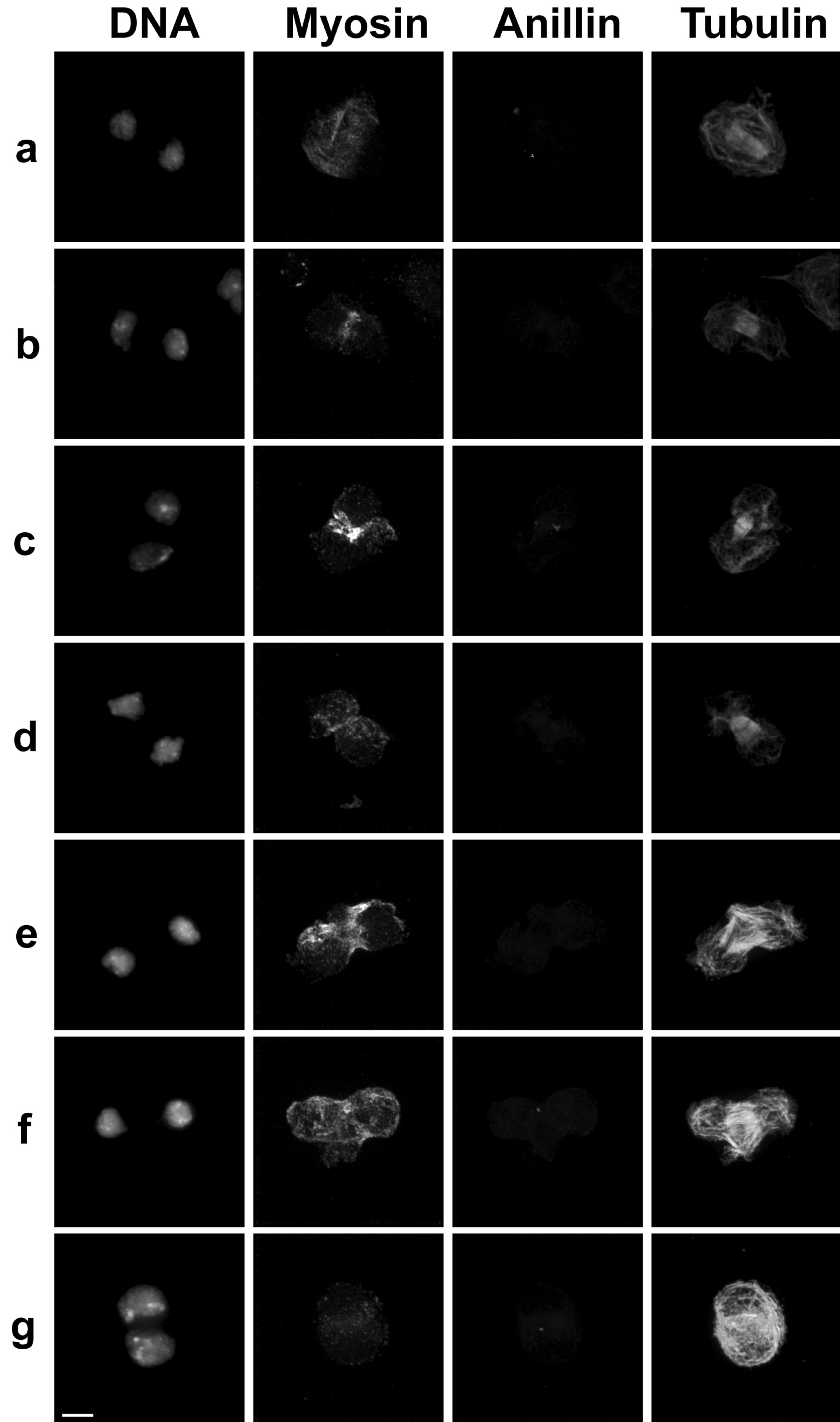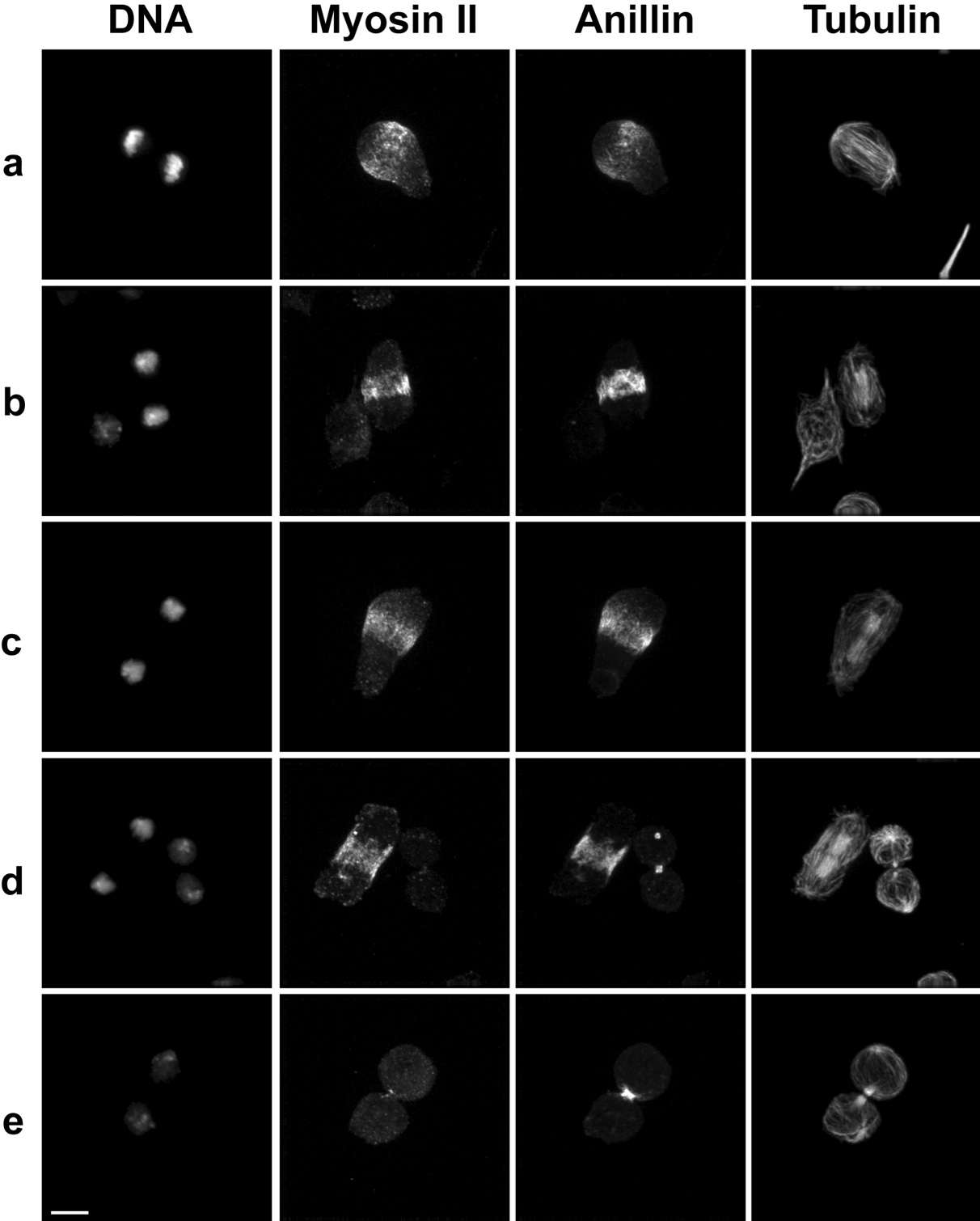 Figure S2 – Drosophila Kc167 cells fixed and stained for DNA, myosin II, anillin and tubulin during different stages of cytokinesis. Scale bar represents 5 μm. |