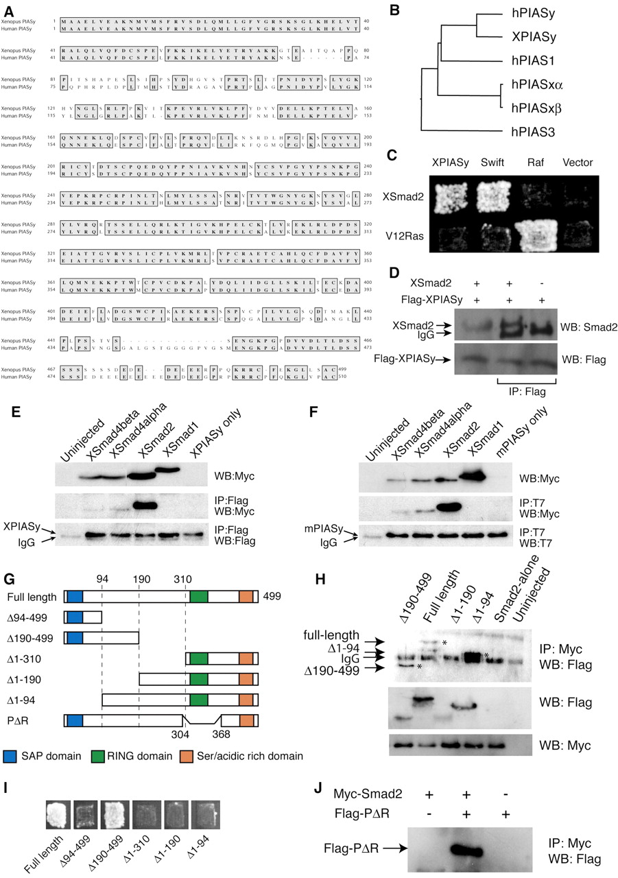 Fig. 1. Identification of XPIASy as a Smad2-interacting protein. (A) An alignment of human and Xenopus PIASy (GenBank AF077952 and AF397163). Shaded amino acids are conserved residues (75% identical). (B) Phylogenetic tree of human PIAS family members and XPIASy. (C) The C-terminal region of XSmad2 binds to XPIASy in a yeast two-hybrid assay. L40 cells were transformed with pLexA-Smad2 (amino acids 180 to 432) or pLexA-Ras(G12V) and with pACTII-XPIASy, pACTII-HK-Swift (Shimizu et al., 2001), pVP-Raf or a vector, pACTII-HK. The interaction was tested by growth on SD-Trp-Leu-His plates supplemented with 10 mM 3-AT for 3 days. (D) Full-length of XSmad2 interacts with full-length XPIASy in immunoprecipitation assay. The mRNA of Flag-tagged XPIASy was injected alone (lane 3) or with XSmad2 (lanes 1,2). (E) XPIASy interacts weakly with XSmad4α or XSmad4β but not with XSmad1. The mRNA of Flag-tagged XPIASy was injected with the indicated Myc-tagged Xenopus Smad members, and interaction was analyzed by immunoprecipitation using anti-Flag antibody. (F) Mouse PIASy interacts strongly with XSmad2 but weakly with XSmad4α or XSmad4β. The mRNA of T7-tagged mouse PIASy was injected with the indicated Myc-tagged Xenopus Smad members, and interaction was analyzed by immunoprecipitation using the anti-T7 antibody. (G) Structures of XPIASy deletion constructs. (H) Immunoprecipitation of XPIASy deletion constructs with full-length of XSmad2. (Upper panel) A western blot of immunoprecipitated samples. The mRNA of Flag-tagged XPIASy construct was injected with Myc-tagged XSmad2 in Xenopus embryos. After immunoprecipitation against Myc, precipitated proteins were analyzed by anti-Flag staining. (Lower two panels) Before immunoprecipitation, expressed proteins were confirmed by Flag and Myc staining. (I) The N-terminal region of XPIASy interacts with the C-terminal region of XSmad2. A yeast two-hybrid assay was performed supplemented with 5 mM 3-AT, using pLexA-Smad2 (amino acids 180 to 432) and XPIASy deletion constructs subcloned into pACTII. (J) Immunoprecipitation of RING domain deleted construct, PδR. The indicated constructs were injected into Xenopus embryos. After immunoprecipitation against Myc, western blotting was performed with anti-Flag antibody. |