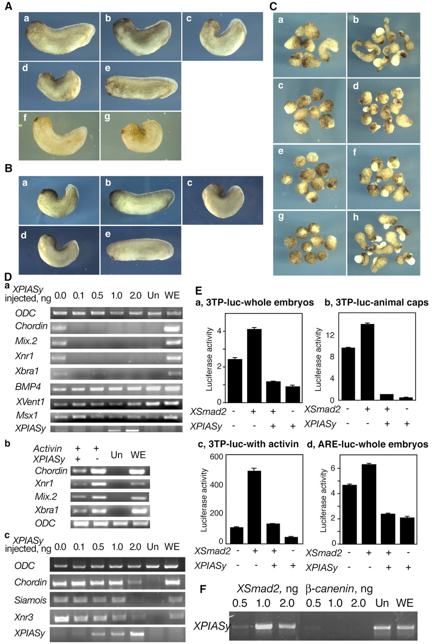 Fig. 3. XPIASy functions as an inhibitor of XSmad2. (A) The effect of XPIASy on embryogenesis. Embryos were injected into the dorsal midline at the four-cell stage with XPIASy mRNA at a concentration of 0.5 ng (a), 1 ng (b), 5 ng (c) or 10 ng (d), or with dominant-negative XSmad2 mRNA at 5 ng (f) or 8 ng (g), and developed until stage 27. (e) Uninjected control. (B) The ventralized phenotype induced by XPIASy is largely rescued by co-injecting with XSmad2, but not with β-catenin. Embryos were injected into the DMZ at the four-cell stage with 1 ng XPIASy (a), 1 ng XPIASy and 0.1 ng XSmad2 (b) or β-catenin at 0.1 ng (c) or 0.5 ng (d). (e) Uninjected embryo. (C) XPIASy inhibits animal cap elongation, mediated by the Smad2/activin pathway. Both blastomeres of two-cell stage embryos were injected with 0.5 ng of XSmad2 (a), XSmad2 and 0.2 pg of activin (b), 0.5 ng of XPIASy (c), XPIASy and activin (d), XSmad2 and XPIASy (e), XSmad2, XPIASy and activin (f), nothing (g), or activin (h). At stage 8, animal caps were dissected and cultured until stage 23. (D) XPIASy inhibits mesoderm marker transcription activated by the Smad2 pathway but only slightly inhibits transcription induced by the Wnt pathway. Semi-quantitative RT-PCR was performed to analyze the effect of XPIASy on transcription of the targets of activin/XSmad2 and Wnt pathways. The mRNAs (0.5 ng) of XSmad2 (a), activin (b) or β-catenin (c) and/or XPIASy were injected into both blastomeres at the two-cell stage. RT-PCR analysis was performed using animal caps as described in the Materials and methods. XPIASy largely reduces the transcription of XSmad2 or activin target genes (Chordin, Mix.2, Xbra1 and Xnr1) but not Smad1/5 target genes (BMP4, Xvent1 and Msx1), (a) while it only slightly reduces the level of β-catenin target genes (Siamois, Xnr3 and Chordin (c). Un, uninjected caps; WE, whole embryos. (E) XPIASy inhibits the transcriptional activity of XSmad2 in luciferase assays using 3TP-luc (a-c) and ARE-luc (d). Reporter plasmid (50 pg) and 0.5 ng of mRNAs of XSmad2 or XPIASy, or both, were injected into both blastomeres of two-cell stage embryos. Luciferase assay was performed using whole embryos (a,c,d) or animal caps (b) in the presence (c) or absence (a,b,d) of activin (0.2 pg) as described in the Materials and methods. (F) XSmad2 and β-catenin regulate expression of XPIASy in positive and negative ways, respectively. The indicated amount of XSmad2 or β-catenin mRNA was injected in the animal side of two-cell stage Xenopus embryos. XPIASy level in animal caps was analyzed as described in the Materials and methods. This PCR-cycle number for XPIASy is higher than that in D. |