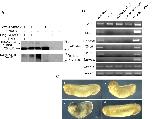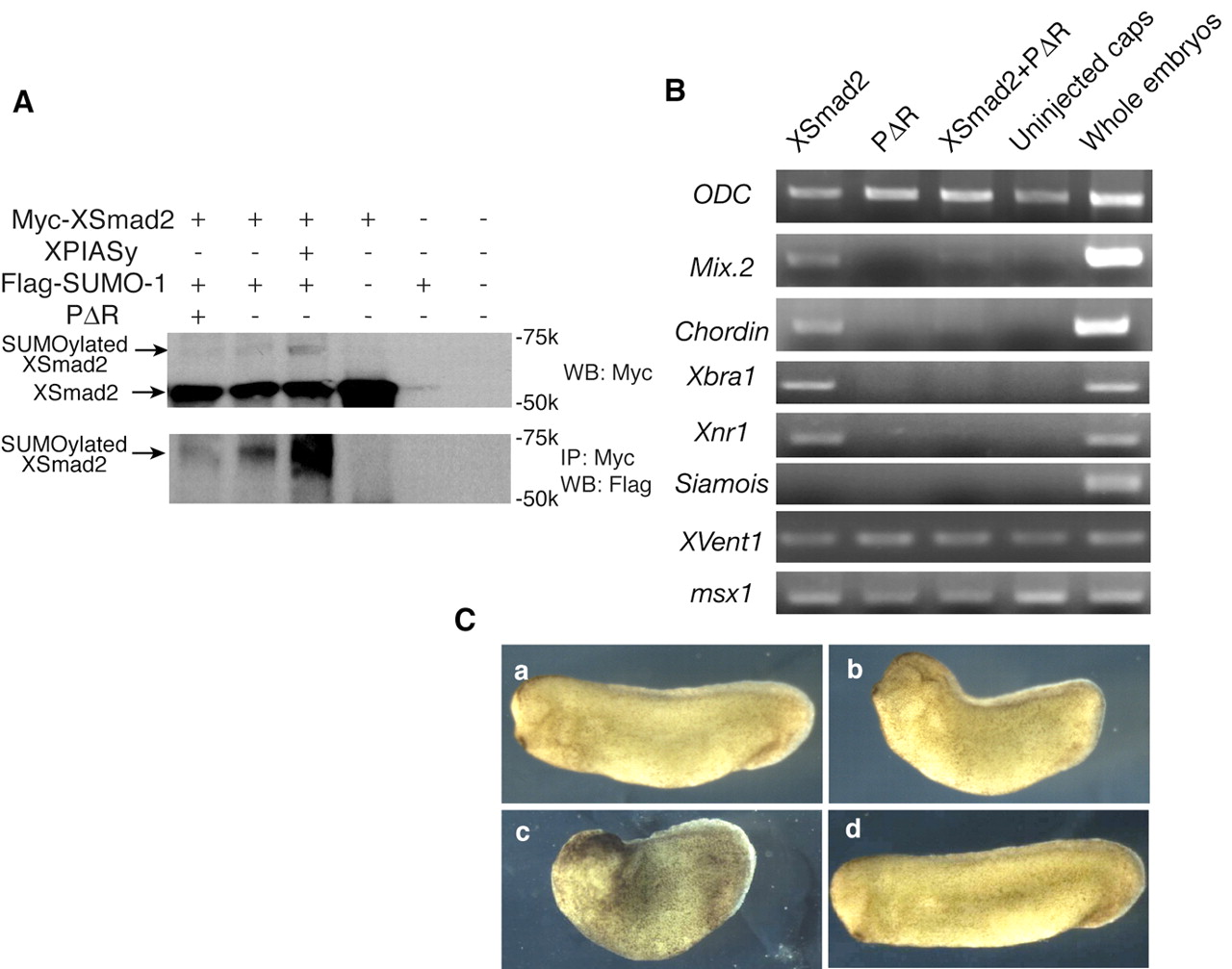 Fig. 4. The RING domain is not absolutely required for the XPIASy activity. (A) XPIASy modifies a small ratio of XSmad2 with SUMO-1. The indicated mRNAs of Myc-tagged XSmad2 (0.5 ng), XPIASy (0.5 ng), flag-tagged SUMO-1 (0.5 ng) and/or PδR (0.5 ng) were injected into blastomeres at the two-cell stage. Status of XSmad2 protein was analyzed at stage 10.5 by western blotting using Myc antibody. In addition, after immunoprecipitation with Myc antibody, the amount of SUMOylated XSmad2 was analyzed with Flag staining. (B) PδR still inhibits mesoderm marker expression induced by XSmad2. The mRNAs of PδR (0.5 ng) or/and XSmad2 (0.5 ng) were injected into both blastomeres at two-cell stage embryos. RT-PCR was performed using the animal caps as described in the Materials and methods. (C) PδR still induces ventralized structures in a dose-dependent manner. The PδR mRNA was injected into the DMZ at the four-cell stage at 1 ng (a), 3 ng (b) and 6 ng (c). The phenotypes were examined at stage 27. (d) Uninjected embryo. |