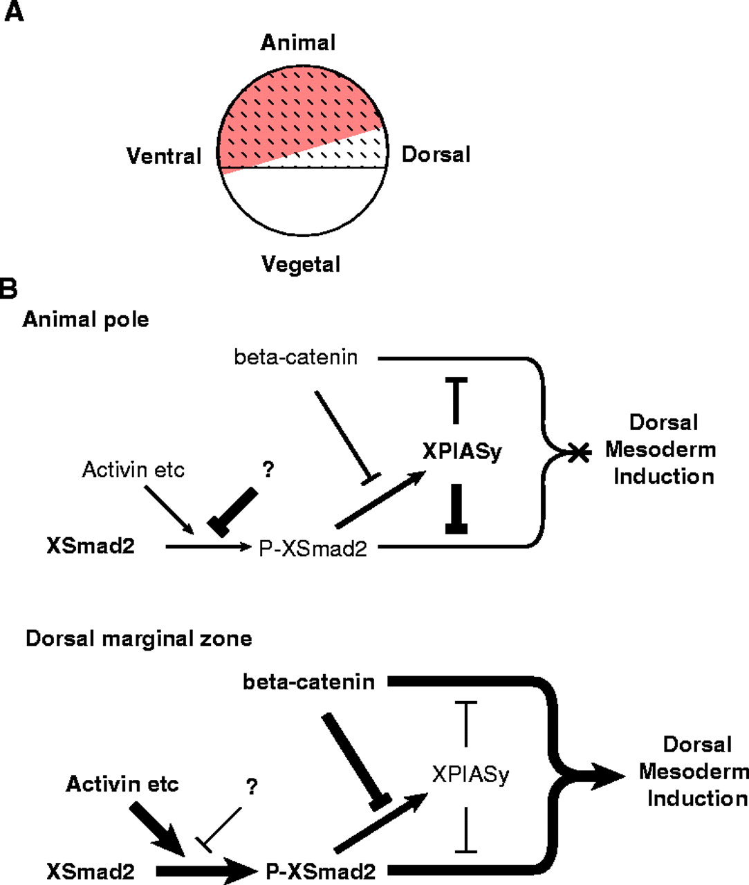 Fig. 6. A possible model of XPIASy activity in mesoderm induction. (A) Expression of XPIASy (orange) and XSmad2 (hatched). (B) A model for the role XPIASy on inhibition of mesoderm induction at the animal pole (top). A model for dorsal mesoderm induction by inhibiting XPIASy expression (bottom). |