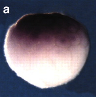 smad2 (SMAD family member 2 ) gene expression in Xenopus laevis embryo, assayed via in situ hybridization, NF stage 18, anterior view, dorsal up. |