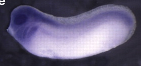 pias4 (protein inhibitor of activated STAT, 4) gene expression in Xenopus laevis embryo, assayed via in situ hybridization, NF stage 28, lateral view, anterior left, dorsal up. |