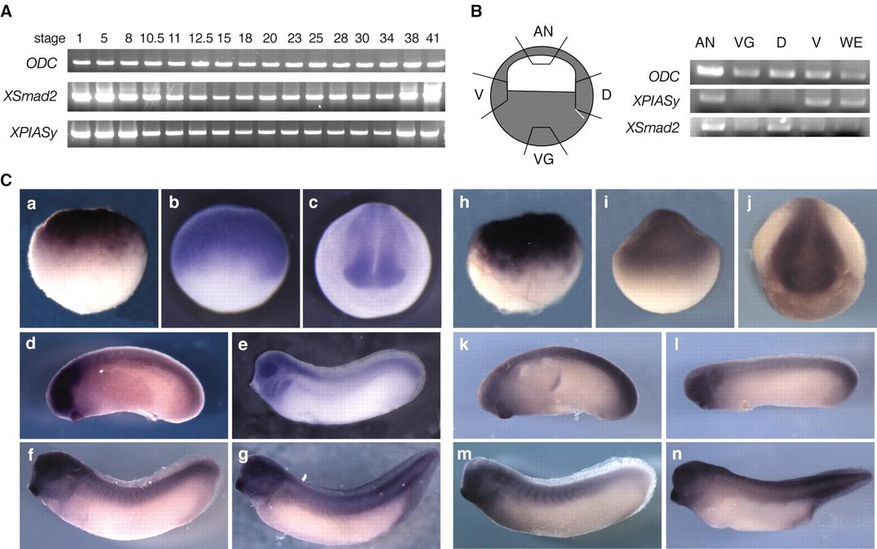 Fig. 2. Expression patterns of XPIASy and XSmad2 during Xenopus development. (A) Semi-quantitative RT-PCR analysis of XPIASy and XSmad2 expression was performed using whole embryos at different stages. ODC (Ornithine decarboxylase) was used as a control. (B) XPIASy and XSmad2 show different temporal expression in the marginal zone at the early gastrula stage. Stage 10 embryos were dissected as shown into animal pole (AN), vegetal pole (VG), DMZ (D) or VMZ (V) explants, or whole embryos (WE), and subjected to RT-PCR analysis of XPIASy and XSmad2. XPIASy is expressed strongly in the VMZ compared with the DMZ. (C) In situ hybridization of XPIASy (a-g) and XSmad2 (h-n) during development. (a,h) Stage 6-1/2, lateral view; (b,i) stage 10; (c,j) stage 18, anterior view; (d,k) stage 25; (e,l) stage 27; (f,m) stage 29/30; and (g,n) stage 37/38. |