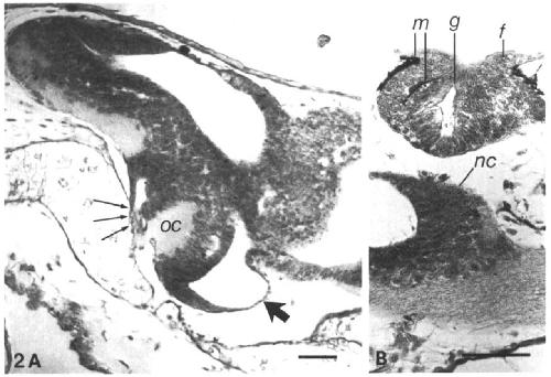arrows), oc, optic chiasma. Bar, 0-1 mm. (B) The grafted stage-18+ VNR was allowed
