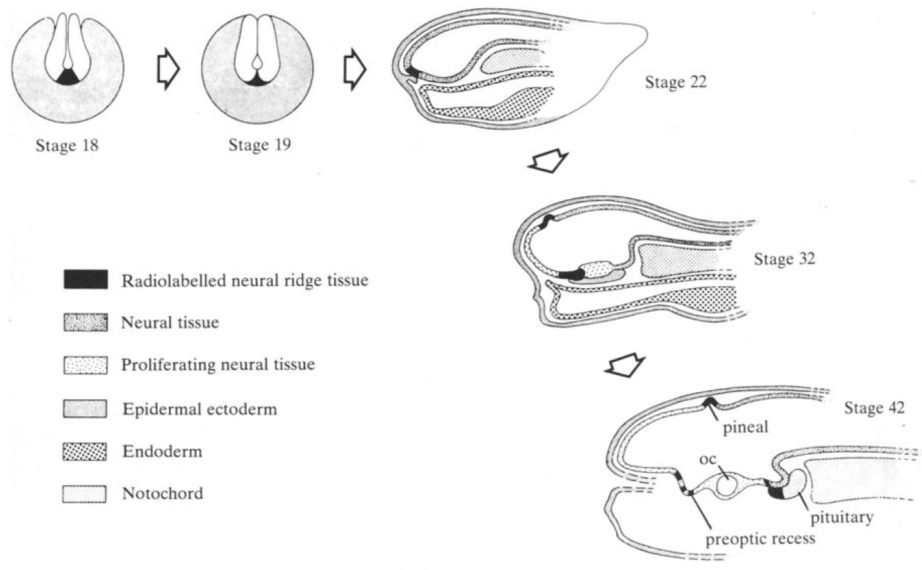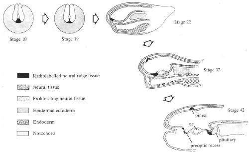 A series of grafting experiments was conducted to determine pituitary origins prior to brain tube closure in Xenopus laevis. Extirpation experiments indicated that the ventral neural ridge (VNR) tissue of stage-18+ embryos was essential for pituitary development. Bolton-Hunter reagent was used to label stage-18+ VNR tissue with 125I, and this tissue was then returned to the donor and its subsequent ontogenesis followed. Labelled tissue was ultimately found in the ventralhypothalamus, the ventralretina, and the anterior pituitary. Using immunocytochemical techniques with antisera to adrenocorticotropin (ACTH), it was found that some of the VNR-derived cells were corticotropes. A region of the nucleus infundibularis which was radioactive labelled also gave ACTH-positive immunoreaction. This might indicate that some ACTH-containing neurones of the hypothalamus are VNR in origin. We suggest that stage-18+ VNR is the site of attachment of brain and anterior pituitaryectoderm. Part of this adherence point is eventually incorporated into the anterior pituitary and will form corticotropes. It is concluded that the ventralretina, the preoptic region of the hypothalamus, some hypothalamic ACTH-immunoreactive cells, and the most anterior portion of the adenohypophysis are all ventral neural ridge in origin.