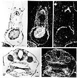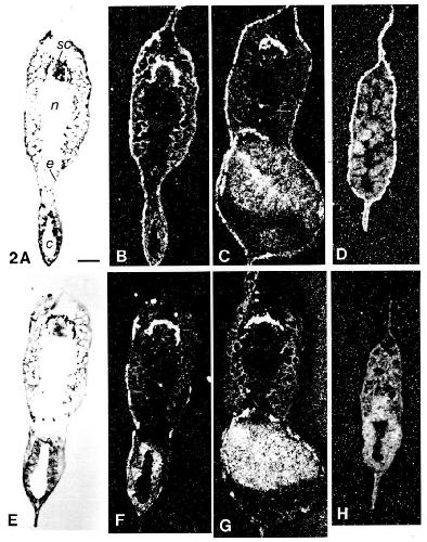 (F) Control hybridization of an adjacent section with pBR322. Abbreviations: e, epidermis; g, gut; n, notochord;/?, pigment granules; s,