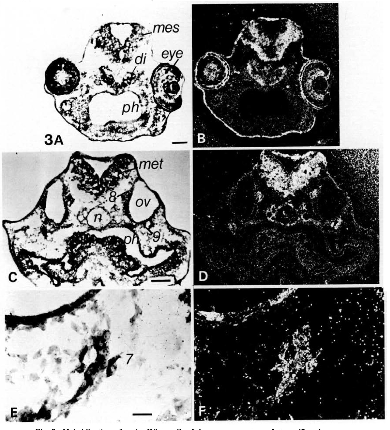 (A,B) Section through the head region at the level of the eyes. Hybridization to cells of