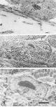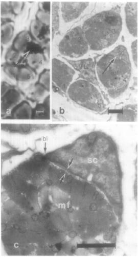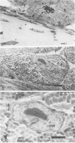 FIG 4. Identification of [3H] thyidine-labeled cell types after 3 weeks of testosterone stimulation. Animals were injected with [3H]thymidine on Days 4 and 5 of the hormone treatment. Two injections were given to assure adequate labeling of myogenic precursors. Method for cell identification was the same as in Fig. 3. (a) Light microscopic autoradiogram of a labeled cell in a 0.5-um plastic section. Label is concentrated over the nucleus (arrow). Bar: 10 pm. (b) Adjacent EM section (X100). The nucleus (mn) is associated with a myofiber containing numerous myofilaments and mitochondria. Bar: 10 um. (c) At higher magnification, the nucleus is clearly located within the cytoplasm, underneath the myofiber cell membrane (arrow). The labeled cell nucleus is thus identified as a myonucleus. Bar: 7.5 um.