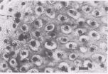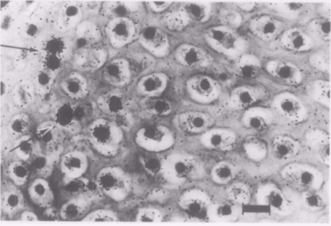 FIG. 2. Autoradiogram of testosterone-treated laryngeal cartilage showing numerous chondrocytes. (Juvenile treated as in Fig. lb). Many cells deep within the cartilagenous matrix accumulate silver grains (e.g., arrows) suggesting that in situ chondrogenesis is stimulated by androgen administration. Bar: 5 Wm.