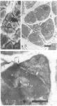 of [3H]thymidine was given and tissue processed 24 hr later. Plastic sections (0.5 pm) of muscle were prepared for tritiated thymidine autoradiography and exposed for at least 3 weeks. Heavy labeling assisted identification of [aH]thymidine-labeled cells. Immediately adjacent thin sections were examined at low magnification under the electron microscope (X100) to locate labeled cells. The identity of the labeled cell nucleus was then determined at higher magnification (X100,000). (a) Autoradiogram of laryngeal muscle obtained after 4 days of testosterone treatment; plane of focus is between tissue and silver grains. Arrow indicates labeled cell nucleus. Bar: 2.5 um. (b) Adjacent low magnification electron micrograph. The three most common nuclei types found in skeletal muscle (myonuclei, mn; satellite cell nuclei, SC; and fibroblast nuclei, fb) can be seen. Only the satellite cell arrow) is labeled. Occasional fibroblasts and endothelial cells (not shown) were also labeled although at a much lower frequency than satellite cells. Abbreviation: (mf, myofiber). Bar: 2.5 um. (c) At higher magnification( x1000,000) a clear boundary (see arrows) can be seen to separate the satellite cell (sc) from the closely apposed muscle fiber (mf). the Satellite cell has a large nucleaous and is enveloped by the basal lamina (bl, arrow) of teh adjacent muscle fiber. Bar: 2um.