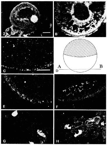 germ plasm in cortex of vegetal pole (C). The solid outermost line of staining in B and C