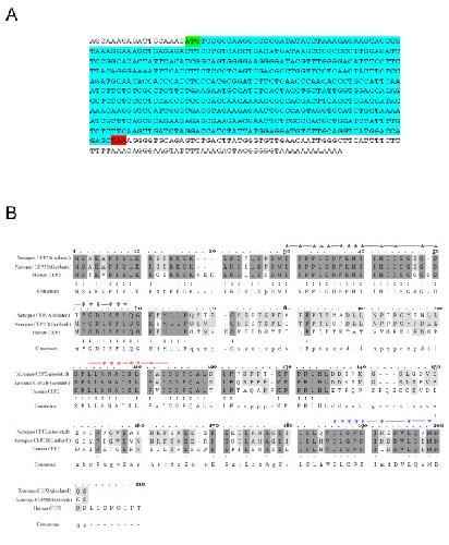Figure 1. XCEP2 Nucleic Acid and Amino Acid Sequences. (A) The nucleic acid sequence of the XCEP2A cDNA is shown. Sequences encoding the start methionine (green), the stop codon (red) are indicated. The protein coding region is shown in blue. (B) Amino acid sequences of the two Xenopus pseudoalleles of CEP2, along with the mammalian (human) sequence, are shown. Asterisks indicate highly conserved residues within the CRIB domain (black asterisks, lines), the CI domain (red asterisks, lines) and the CII domain (blue asterisks, lines) in the CEP-2 protein. Dark gray shading indicate residues conserved in all three species; light gray areas indicate residues that are conserved between two of the three species listed. Vertically oriented pairs of dots (:) indicate positions where amino acid identity is conserved in all three sequences.