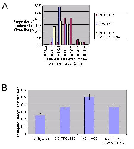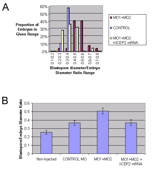Figure 6. Rescue of the antisense XCEP2 morpholino phenotype by XCEP2 mRNA co-injection. Injected embryos received 100 ng of morpholino oligonuceotide in the animal region of both blastomeres in two-cell stage embryos. MO1 and MO2 oligonucleotides were mixed at a molar ratio of 3:1, respectively. 20–30 embryos were assessed for each condition. (A) The distributions of blastopore to embryo diameters for the indicated experimental conditions are shown. The rescuing XCEP2 mRNA (XCEP*-myc) sequence was altered such that antisense morpholino oligonucleotides would be expected to bind inefficiently. (B) Average blastopore to embryo diameter ratios, +/- 2 SEM, are indicated for each experimental condition.