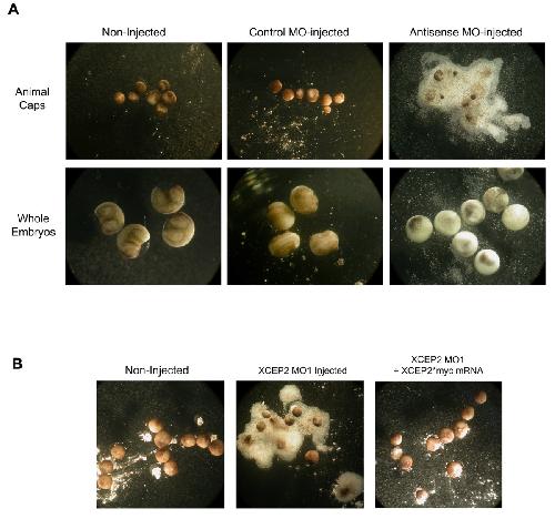 Figure 8. Effects of antisense XCEP2 Morpholino oligonucleotides on animal cap explant cell adhesion. (A) 100 ng morpholino oligonucleotide MO1 was injected into the animal region of each blastomere of 2-cell stage embryos. Animal cap explants from antisense MO1-injected embryos exhibited a marked loss of integrity (upper right panel) 24 hours after explantation, as compared to animal caps from non-injected or control morpholino injected embryos (upper left panels). Effects of these treatments on whole sibling embryos at Stage 223 are shown in the lower panels. In (B), embryos were injected with 75 ng of MO1 antisense morpholino in each blastomere at the 2-cell stage. Animal explants derived from non-injected embryos (left panel), MO1-injected embryos (middle panel), or embryos co-injected with 0.7 ng XCEP2*myc mRNA (right panel) are shown 24 hours after explantation.