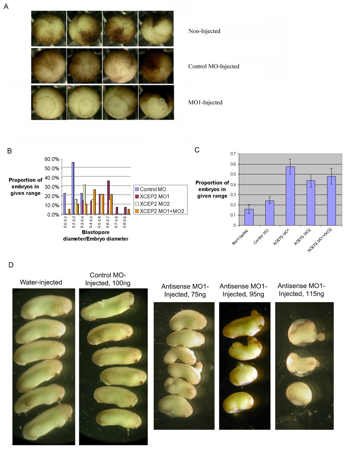 Figure 4. Effects of antisense XCEP2 morpholino oligonucleotide on gastrulation. (A) Injected embryos received 100 ng of morpholino, delivered to the animal region of 1-cell embryos. Typical gastrula stage embryos for each of three experimental conditions (non-injected, control morpholino and MO1 antisense injected) are shown. (B) The distribution of blastopore-to-embryo diameter ratios for each experimental condition. 180 embryos were assessed for each condition. In the combined "MO1+MO2" condition, 50 ng of each morpholino were co-injected. (C) Average blastopore to embryo diameter ratios for each of the control and experimental conditions, +/- 1SEM, are shown. (D) Effects of antisense morpholinos on post-neurulation embryonic development are shown. Antisense XCEP2-injected embryos exhibit dose-dependent abnormalities suggestive of gastrulation and/or convergence extension defects. Representative viable embryos, at Stage 267, from each control and experimental condition are shown. Several embryos in the MO1 treated groups exhibited varying degrees of spina bifida. Embryonic viability for the water, control morpholino, and the three doses of antisense XCEP2 morpholino (75 ng, 95 ng and 115 ng) were 90%, 90%, 81%, 63%, and 26%, respectively (200 embryos injected for each condition).