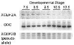 Figure 2. Temporal regulation of XCEP2 during pre-neurula stages of embryonic development. Semi-quantitative RT-PCR was conducted on equivalent amounts of RNA derived from the indicated developmental stages. XCEP2A was amplified using XCEP2A forward and reverse primers (see Methods). Ornithine Decarboxylase (ODC) serves as a loading control (middle panel). RT-PCR amplification to reveal expression of the alternative pseudoallele (XCEP2B), using XCEP2B forward and reverse primers, is shown in the lower panel.