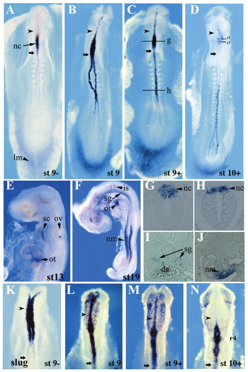 Fig. 2. Expression pattern of Cv-2 in the chick embryo. Whole-mount in situ hybridisations of Cv-2 (A-F) and Slug (K-N) and transverse sections of Cv-2 hybridised embryos (G-J). (A) HH stage 9â (seven-somite stage). Cv-2 expression is detected in posteriorlateralmesoderm (lm) and in premigratory neural crest (nc) in the hindbrain and anterior spinal cord. (B) Stage 9 (eight somites). Cv-2 expression is upregulated in premigratory neural crest in the hindbrain and spinal cord, and in some cells in the midbrain. (C) Stage 9+ (10 somites). Expression seen at stage 9 persists but (D) by stage 10+ (13 somites) Cv-2 expression in the hindbrain and anterior spinal cord is downregulated. Low levels of Cv-2 expression occur in the hindbrain in rhombomeres 3 and 5. (E) Stage 13. Cv-2 transcripts are detected at the posterior lip of the otic vesicle (ov), the outflow tract of the heart (ot) and sclerotome surrounding the dorsal aorta between the branchial arches (sc). (F) Stage 19. Cv-2 transcripts are detected in the intersomitic region (is), in sympathetic ganglia (sg), in the outflow tract of the heart (ot) and in nephrogenic mesenchyme (nm). (G,H) Transverse sections through the neural tube of stage 9+ as indicted in C show that Cv-2 transcripts are restricted to premigratory neural crest cells (nc) in the dorsal neural tube. (I,J) Transverse sections through a stage 19 embryo, showing Cv-2 expression in (I) sympathetic ganglia (sg) adjacent to the dorsal aorta (da) and in (J) nephrogenic mesenchyme (nm) surrounding the nephric ducts. (K-N) In situ hybridisation to detect slug transcripts, a marker of premigratory and migrating neural crest from stage 9â to stage 10+. Black arrowheads identify the midbrain/hindbrain boundary, black arrows indicate the posterior limit of the hindbrain.