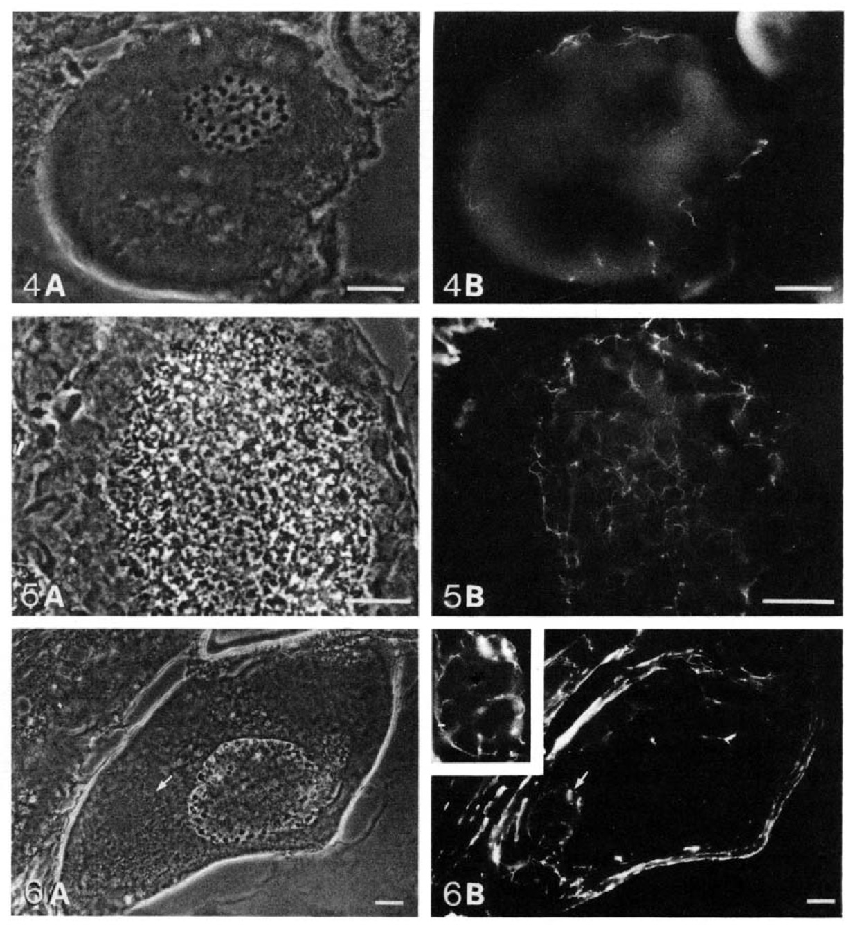 (arrows) stained with LE65. (A) phase contrast; (B) fluorescence. Inset shows