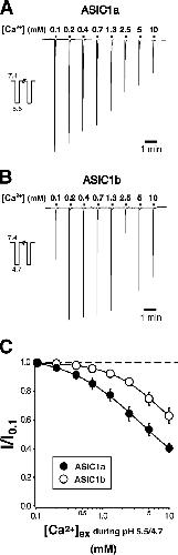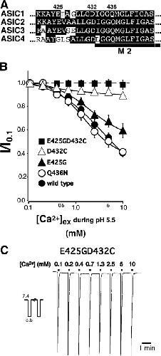 Acid-sensing ion channels ASIC1a and ASIC1b are ligand-gated ion channels that are activated by H+ in the physiological range of pH. The apparent affinity for H+ of ASIC1a and 1b is modulated by extracellular Ca2+ through a competition between Ca2+ and H+. Here we show that, in addition to modulating the apparent H+ affinity, Ca2+ blocks ASIC1a in the open state (IC50 approximately 3.9 mM at pH 5.5), whereas ASIC1b is blocked with reduced affinity (IC50 > 10 mM at pH 4.7). Moreover, we report the identification of the site that mediates this open channel block by Ca2+. ASICs have two transmembrane domains. The second transmembrane domain M2 has been shown to form the ion pore of the related epithelial Na+ channel. Conserved topology and high homology in M2 suggests that M2 forms the ion pore also of ASICs. Combined substitution of an aspartate and a glutamate residue at the beginning of M2 completely abolished block by Ca2+ of ASIC1a, showing that these two amino acids (E425 and D432) are crucial for Ca2+ block. It has previously been suggested that relief of Ca2+ block opens ASIC3 channels. However, substitutions of E425 or D432 individually or in combination did not open channels constitutively and did not abolish gating by H+ and modulation of H+ affinity by Ca2+. These results show that channel block by Ca2+ and H+ gating are not intrinsically linked.
