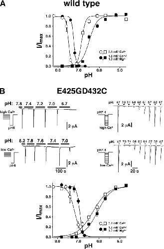 Figure 6. . Channels containing the double substitution E425GD432C still show Ca2+-dependent shifts of steady-state inactivation and pH activation curves. (A) Dose–response curves for steady-state inactivation by H+ and for activation by H+ with different Ca2+ concentrations for ASIC1a wild type. The curve for steady-state inactivation was published previously (Babini et al., 2002). For steady-state inactivation curves, oocytes were preincubated for 2 min at a conditioning pH varying between 8.2 and 6.7. After this preincubation, available channels were activated by switching to a solution of pH 6.0 containing 140 mM NaCl, 1.8 mM CaCl2/1.0 mM MgCl2. The preincubation solution contained 140 mM NaCl and either 1.8 mM CaCl2/1.0 mM MgCl2 (•) or 0.1 mM CaCl2 (○). The preincubation solution with 0.1 mM CaCl2 also contained 0.1 mM niflumic acid to block the large conductance induced in oocytes by divalent-free extracellular solutions. For H+ activation curves, the preincubation solution contained 140 mM NaCl, 1.8 mM CaCl2/1.0 mM MgCl2; pH 7.8. Every 30 s, a test solution with a pH ranging from 7.4 to 4.7 was applied for 3 s. The test solution contained 140 mM NaCl and either 1.8 mM CaCl2/1.0 mM MgCl2 (▪) or 0.1 mM CaCl2 (□). (B) Top left, representative traces of ASIC1aE425GD432C currents showing steady-state inactivation at two different Ca2+ concentrations. Top right, representative traces of ASIC1aE425GD432C currents showing activation by H+ at two different Ca2+ concentrations. pH was as indicated. Duration of solution application and concentration of NaCl and CaCl2 were as described in A. Bottom, dose–response curves for steady-state inactivation and activation with different Ca2+ concentrations for ASIC1aE425GD432C.