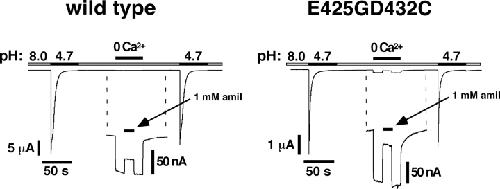 Figure 7. . Removal of extracellular Ca2+ opens ASIC1aE425GD432C. ASIC1a channels were first activated by pH 4.7. 60 s after recovery in pH 8.0, a solution containing no Ca2+ and no Mg2+, but 10 mM EDTA was applied; the concentration of Ca2+ in this solution should be in the low picomolar range. As can be seen from the blow-up, this divalent-free solution induced a small amiloride-sensitive current in ASIC1a wild type–expressing oocytes (left) as well as in E425GD432C-expressing oocytes (right). A similar response was seen in six independent oocytes for each condition. Solutions contained 0.2 mM flufenamic acid to block the large conductance induced in oocytes by divalent-free extracellular solutions.