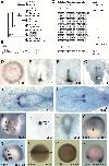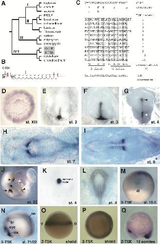 Fig.1. Primary Structure and Expression of TSK(A) Phylogenetic tree of the SLRP family. We used human protein sequences, C-TSK, and X-TSK in a Clustal W analysis.(B) Schematic drawing of the primary structure of C-TSK. LRRs are indicated as circles. Cysteine residues are indicated as red bars. SP, signal peptide.(C) 11 leucine-rich repeats have been aligned and yield a C-TSK consensus sequence (indicated at bottom). Conservation of leucines has been calculated (%).(DâJ) In situ hybridization with C-TSK.(D) Stage XIII. The expression is detected mainly in the epiblast of the area opaca and weakly in the hypoblast.(E) Stage 2. Expression in the newly formed primitive streak.(F) Late stage 3. Expression in the primitive streak.(G) Stage 4. Expression in the primitive streak (white arrowhead) and Hensen's node (black arrowhead).(H) Stage 7.(I) 8+ embryos. Strong expression in the newly formed somites.(J) Stage 25. Expression in wing and leg buds (black arrows), the edge of pharyngeal arch 2 (black arrowhead), and nasal pit (white arrowhead).(K) Stage 4. Localized expression of chordin in Hensen's node.(L) Expression of BMP4 at stage 4.(M and N) In situ hybridization with X-TSK at stage 10.5 (M) and stage 21/22 (N); br, branchial crest segment; ma, Mandibular crest segment; so, somite.(OâQ) In situ hybridization with Z-TSK at shield stage (O, lateral view; P, anterior view) and 10 somite stage (Q, lateral view). |