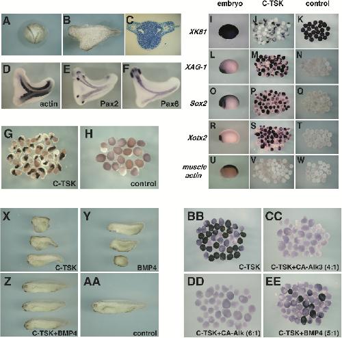 Fig.2. C-TSK Functions as a BMP Antagonist in Xenopus(AâF) C-TSK mRNA (400 pg) was injected into a ventral vegetal blastomere at the 8-cell stage and embryos were developed until stages 20 (A) and 31 (B). A transverse section (C) through the trunk region. In situ hybridization with actin (D), Pax2 (E), Pax6 (F) at stage 31.(G and H) VMZ explants injected with C-TSK were dissected at stage 10, cultured until stage 24, and subjected to in situ hybridization with muscle actin.(IâW) Animal cap assay.(I, L, O, R, and U) Marker expression in normal embryos at stage 21/22. Animal caps were prepared from stage 9 embryos that had been injected with 1.6 ng TSK (J, M, P, S, V) or control (K, N, Q, T, W). Animal caps were harvested at the time equivalent to stage 21/22 and hybridized with XK81 (IâK), XAG-1 (LâN), Sox2 (OâQ), Xotx2 (RâT), and actin (UâW) probes.(XâAA) Effect of C-TSK and BMP4 on dorsal-ventralization. After injection of the indicated constructs into 4 vegetal blastomeres at 8-cell stage, the effects on the D-V patterning were scored.(X) 1 ng of C-TSK (1 ng) per blastomere (DAI 6â7).(Y) 0.5 ng of BMP4 (DAI 0â3).(Z) 1 ng of C-TSK + 0.5 ng of BMP4 (DAI 4â5).(AA) 1 ng of C-TSK + 1 ng of BMP4 (DAI 0â2).(BB-EE) Effect of inhibition of BMP signal on TSK activity. After animal caps were prepared from stage 9 embryos that had been injected with 1.6 ng of C-TSK (BB), 3.2 ng of C-TSK + 0.8 ng of CA-Alk3 (CC), 4.8 ng of C-TSK + 0.8 ng of CA-Alk3 (DD), 2.5 ng of C-TSK + 0.5 ng of BMP4 (EE), expression of XAG-1 was analyzed. |