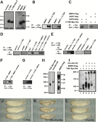 Fig.3. TSK Directly Binds to BMPs and Chordin(A) Western blot analysis of C-TSK-Myc-His, BMP4-Flag, and BMP7-Flag proteins used. C-TSK-Myc-His was treated with N-glycosidase F (lane 3).(B) Coimmunoprecipitation of C-TSK-Myc-His and BMP4-Flag or BMP7-Flag. After immunoprecipitation with nickel chelating resins, bound BMP-4 and BMP7 were detected by immunoblotting with anti-Flag antibody.(C) Competition assay. Coimmunoprecipitation of C-TSK-Myc-His and BMP4-Myc or BMP7-Myc in the presence or absence of BMP4-Flag.(D) Coimmunoprecipitation of C-TSK-Myc-His and activin-Flag, Vg1-Myc, or ADMP-Myc. After immunoprecipitation with His-tag, bound protein was detected by immunoblotting with anti-Flag or anti-Myc antibody.(E) Coimmunoprecipitation of C-TSK-Myc-His and chordin-HA, noggin-flag, or follistatin-Myc. After immunoprecipitation with His-tag, bound protein was detected by immunoblotting with anti-HA, anti-Flag, or anti-Myc antibody. Note that BMP4 enhances the binding between TSK and chordin.(F) The amount of BMP4 pulled down by C-TSK was increased in the presence of chordin. C-TSK-Myc-His was incubated with BMP4-Flag in the presence or absence of chordin. After immunoprecipitation with His-tag, bound BMP4-Flag was detected.(G) The amount of TSK pulled down by chordin was increased in the presence of BMP4. Chordin-Myc-His was incubated with C-TSK-Flag in the presence or absence of BMP4. After immunoprecipitation with His-tag, bound C-TSK was detected.(H) Synthetic mRNAs (1.2 ng of each RNA/embryo) encoding C-TSK-Myc-His, BMP4-Flag, or chordin-HA were injected into Xenopus embryos. Embryo extracts were subjected to SDS-PAGE under nonreducing conditions. Expression of proteins was analyzed by antibodies against their fused tags.(I) Synthetic mRNAs indicated in the figure were injected into all blastomeres of Xenopus embryos (lanes 1â5). TSK mRNA was injected in a blastomere while BMP4 and chordin mRNAs were injected another blastomere (lane 6). At stage 9, the embryos were treated with DTSSP and lysed. The embryo extracts were immunoprecipitated with an antibody against His tag and subjected to SDS-PAGE under nonreducing conditions. The blots were stained by the following antibodies: anti-Myc antibody (lanes 1â3), anti-FLAG antibody (lane 4), and anti-HA antibody (lanes 5 and 6).(JâL) Cooperative effect between C-TSK and chordin; 12.5 pg of C-TSK (J); 12.5 pg of C-TSK + 2.5 pg of Xenopus chordin (K); 2.5 pg of Xenopus chordin (L). |