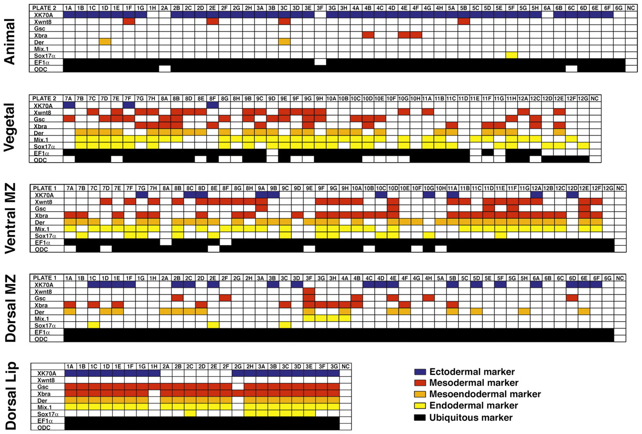 that did not show a signal for any marker are not included in the table. XK70A, an ectodermal gene, is represented in blue, mesodermal genes