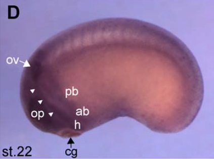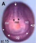 Fig. 3. Xtrb2 expression during early Xenopus embryogenesis. (A, B) In situ hybridization of Xtrb2 at stage 15. Anterior dorsal view (A) and lateral view (B) are shown. A white arrow indicates the dorsal midline. (C, D) Xtrb2 expression at stage 22/23. Anterior view of the head (C) and lateral view (D). Strong expression was observed in the optic placode, otic vesicle, and neural crest. Arrowheads indicate a streak of cells from the otic vesicle (ov) towards the cement gland (CG). Weak staining of somites was also detected. (EâI) Expression pattern of Xtrb2 at stage 26. Lateral view in the head (E), dorsal view (F), and transverse sections (GâI) as indicated in (E) and (F). Note the lack of Xtrb2 expression in the floorplate (fp) along the neural tube. Weak expression was observed in pronephros. Abbreviations: cg, cement gland; mn, motor neuron; nc, neural crest; pl, placodes; n, notochord; fp, floor plate; pn, pronephros; op, optic vesicle; ov, otic vesicle; ab, anterior branchial; pb, posterior branchial; h, hyoid neural crest. |