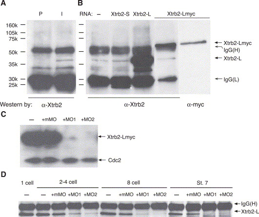 Fig. 5. Detection of Xtrb2 proteins in vivo and suppression of translation by antisense morpholino oligonucleotides. (A) Western blot of immunoprecipitates from stage 6.5 embryos either with preimmune (P) or anti-Xtrb2 (I) antisera. (B) Western blot of anti-Xtrb2 immunoprecipitates from stage 7 embryos. Protein extracts were prepared from 20 embryos either uninjected or injected with the indicated RNA; 0.5 ng/embryo of Xtrb2-S or Xtrb2-L RNA or 0.25 ng/embryo of myc-tagged Xtrb2-L RNA were injected. Asterisk indicates exogenous Xtrb2-S protein. Positions of Xtrb2-L, Xtrb2-Lmyc, as well the as IgG heavy chain and light chain [IgG(H) and IgG(L), respectively], are indicated. (C) Western blot of total embryo extract (40 μg per lane) with anti-myc and anti-cdc2 antibody. Extract was prepared from stage 6.5 embryos injected with myc-tagged Xtrb2-L RNA (500 pg) and MOs as indicated. (D) Anti-Xtrb2 Western blot of immunoprecipitates from 50 embryos either untreated or injected with MOs as indicated. Embryos were collected at the 2- to 4-cell stage (135 min after fertilization), the 8-cell stage (165 min after fertilization), or at blastula stage 7. |