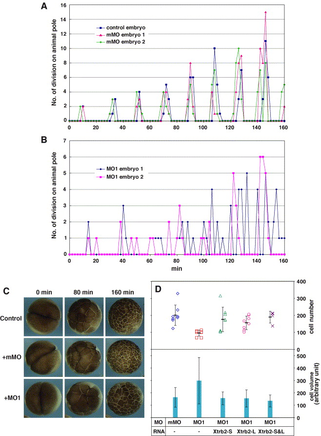 Fig. 6. Slow and asynchronous cleavage caused by suppression of Xtrb2 translation. (A, B) Embryos were either untreated or injected with mMO or MO1 and were subjected to time-lapse recording after the first cell division (when t = 0). The numbers of new cleavage furrows at each time point on the animal half of the embryos were counted and plotted during the time course. (C) Time-lapse images of the embryos at 0, 80, and 160 min. (D) Rescue of the delayed cell division phenotype by Xtrb2 RNA. Morpholino oligonucleotides (0.25 pmol) were injected into a single tier A blastomere of Xenopus embryos at the 32-cell stage, together with fluoresceinâdextran and Xtrb2-L or Xtrb2-S RNA, either individually (100 pg RNA) or in combination (50 pg of each RNA). Cells were dissociated and fixed at stage 9. The numbers of fluorescein-positive cells in each animal cap were counted, and their diameters were measured. The upper plot shows cell numbers derived from two independent experiments, and the bars indicate the average cell numbers per animal cap (±SD). The volumes of cells were estimated from their diameter, and their averages (±SD) are plotted in arbitrary units. The experiment involving coinjection of Xtrb2-L and Xtrb2-S RNA together with MO1 was carried out once. Xtrb2 RNAs rescue the cleavage defect caused by MO1 (P < 0.001). |