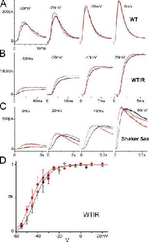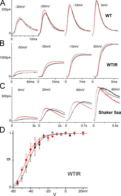 Figure 4. Stretch and other Shaker mutants. Sample currents taken before, during, and after stretch at a range of voltages for (A) Shaker WT (fast N-type inactivation present), (B) Shaker WTIR, and (C) Shaker 5aa. (D) Average normalized g(V) (n = 4) from peak tail current amplitudes, with and without stretch, for WTIR. Fits with a fourth order Boltzmann (Eq. 3 to the fourth power). z = 3.3 for both curves, K0 = 0.00093 and 0.00062 for without stretch and with stretch, respectively. The resulting total gating charge of ∼13 (i.e., 4 × 3.3) is in agreement with the literature. Determining the g(V) with the tail current method is problematic for WT and 5aa, as they possess similar time scales of activation and inactivation, however it is clear from the sample currents in A and C that their g(V) relations would be left shifted, too. (Colors and symbols as in Fig. 3). |