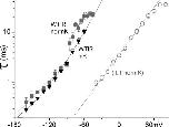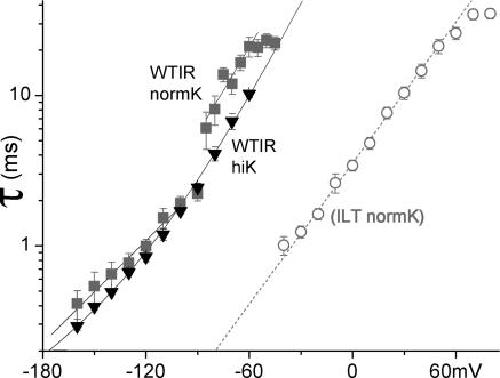 Figure 6. Resolvable tail currents at various voltages. WTIR tail current τ(V) in normK (n = 8) (gray squares) and hiK (n = 6) (black inverted triangles) compared with the ILT tail τ(V) (n = 9) in normK (gray open circles) from Fig. 1 B. Double exponential fit for WTIR hiK: τ0,1 = 170 ms, z1 = 1.3, τ0,2 = 4.2 ms, z2 = 0.46. Due to a discontinuity near EK, WTIR normK cannot be fitted in its entirety; the shallow and steep branches were fitted with single exponentials (shallow branch: z = 0.67, τ0 = 25 ms, steep branch: z = 1.1, τ0 = 300 ms). ILT tail τ(V) is from Fig. 1 B (single exponential z = 0.92, τ0 = 3.6 ms). For net K+ movement being inward, WTIR closing was faster; the lack of a shallow branch or a τ(V) jump in ILT makes sense if the discontinuity (in WTIR normK) depended on a change in current direction. |