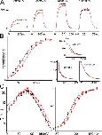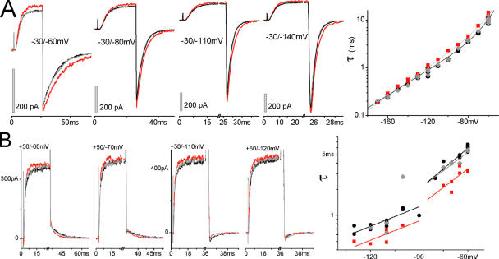 Figure 7. WTIR and stretch. (A) Stretch-slowed tail currents (recorded in hiK) samples and τ(V) with double exponential fit: τ0,1 = 34 ms, z1 = 0.78, τ0,2 = 3.6 s, z2 = 2.8 without stretch, τ0,1 = 62 ms, z1 = 0.88, τ0,2 = 3.4 s, z2 = 2.8 with stretch. (B) Stretch-accelerated WTIR tail currents recorded in normK; τ(V) cannot be fitted with double exponentials. Fits with two separate lines: left branch (before and during [after cannot be fitted]) τ0 = 5.9/4.0 ms, z = 0.44/0.44; right branch (before, during, after): τ0 = 52/25/38 s, z = 0.93/0.85/0.85. |