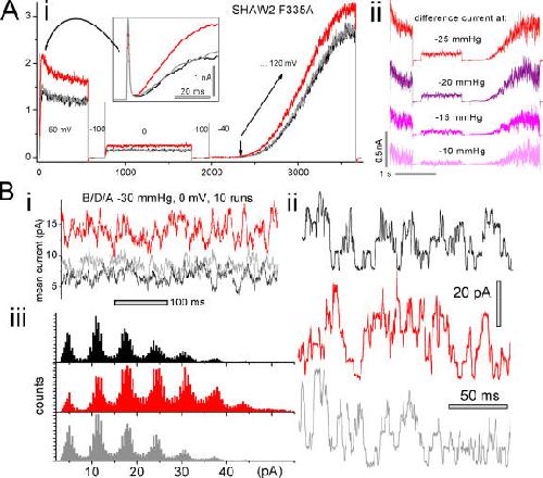 Figure 8. Effects of stretch on Shaw2 F335A. (A i) Shaw2 F335A macroscopic current (single traces) during a multistep protocol (voltages indicated in mV; protocol rationale is given in the text), before, during, and after stretch (using −25 mm Hg). An expanded inset reveals that current onset was sigmoid shaped. (A ii) From the same patch, stretch difference currents at the indicated levels of applied suction (difference currents = [(before + after)/2 – during]). (B) From an oocyte expressing Shaw2 F335A at a low level, (B i) current at 0 mV (10 traces averaged; membrane continuously at 0 mV, using −30 mmHg) before, during, and after stretch. From the same patch (but using −35 mm Hg), (B ii) excerpts from single traces, and (B iii) all-points amplitude histograms from eight runs per condition (i.e., before/during/after stretch) during steps from −100 to 0 mV show that the outward (=upward) unitary current jump amplitude (6.5 pA) was stretch independent. Since for this patch, linear subtraction was not done, interference from the capacitative current was avoided by omitting the first 200 ms of each run for ii and iii. |