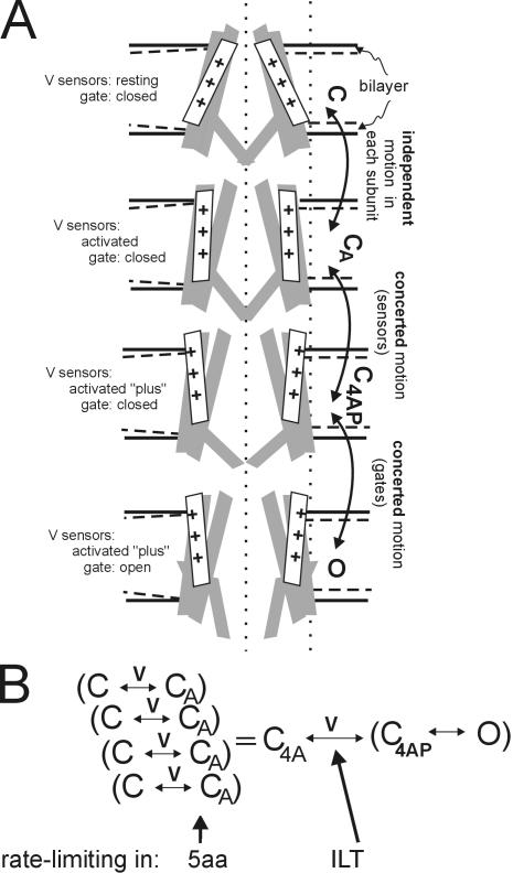 Figure 1. Schematic for Kv motions and kinetics. (A) Section through a bilayer-embedded Shaker in conformations C, CA, C4AP, and O (closed, closed-but-activated, closed-4subunits-activated-plus, open). First, consider the bilayer and the bilayer-protein interface; details of the bilayer's laterally acting forces on Kv channels are unknown, but as Fig 4 of Morris and Laitko (2005) and associated references point out, bilayer forces contribute to conformational equilibria. Insofar as the bilayer thins with stretch (dashed lines in each leaflet) the channel–lipid interface will change (two possibilities are depicted: accommodation on the left, mismatch on the right). Next, the protein conformations themselves. The vertical dotted lines are for positional reference. A closed-resting state (C) is depicted with the voltage sensors in a position stabilized by hyperpolarization. In the closed-activated (CA) states favored by depolarization, the sensors and neighboring domains repack (the motions that yield C1A–C4A are largely independent), but the gates remain shut. Each C→CA subsumes greater complexity (e.g., to describe Shaker WTIR and ILT gating current, two independent steps in series are needed; Ledwell and Aldrich, 1999), which we ignore here. Next are two concerted motions. First four voltage sensors do a final motion together (yielding “activated-plus”). The next concerted step is opening of the tetrameric gate, C4AP→O. B summarizes this as a kinetic scheme showing the voltage-dependent steps. In ILT, the concerted voltage-dependent forward rate C4A→C4AP is rate limiting (Del Camino et al., 2005), whereas in Shaker 5aa, we found (Laitko and Morris, 2004) that independent voltage-dependent steps that we take to be C→CA are rate limiting. In WT channels, the two rates are similar, making it harder to distinguish activation from pore opening. |