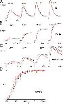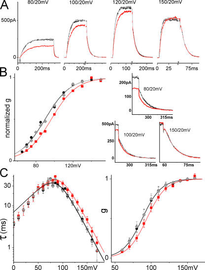 Figure 3. Stretch and ILT currents. Here and for other figures, black (lines or filled circles) = before stretch, red (lines or squares) = during stretch, gray (lines or diamonds) = after stretch. Data from a sample patch. (A) Averaged sample currents (n = 5 runs; repeats were done in succession before moving to another voltage), for steps from −90 mV to the indicated voltage and back to 20 mV, with axis breaks to better visualize the tail. For the leftmost set of currents, an arrow marks the start of the depolarizing step. In all sets, a time scale is provided by labels at t = 0 and at the first major tick (“0” marks the start of recording, not the beginning of a step; the initial flat section is the holding current at −90 mV). Below, at right, for three voltages, tail currents are shown on expanded time scales, as indicated. (B) g(V) relation from tail current amplitudes after stepping back to 20 mV. The fit with Eq. 3 shows that gating charge is unaffected by stretch, whereas K0 increased (z = 1.9, K0 = 700/1170/720 for before/during/after). (C) Averaged τ(V) (seven patches) and normalized g(V) (four patches) with and without stretch, fits with Eqs. 1 and 3 in the range of activation voltages. z and K0 from the g(V) fit (z = 2.0, K0 = 780 without and 1260 with stretch) describe τ(V) very well (zα = 1.3, α0 = 0.18 s−1 without and 0.11 s−1 with stretch). |