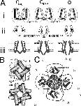 Figure 9. Kv1 structure cartoons. (A i) A cartoon modified from Pathak et al. (2005) depicts the last concerted motion of the voltage sensor exerting a laterally acting (expansion) force within the protein. Subsequently, a concerted relaxation pulls open the channel gate (presumably this expands the hinge region). A ii suggests that the last charge concerted movements could, alternatively, couple to forces that constrict or compact the closed channel (“spring extension”) before a concerted gate region expansion (“spring relaxation”) that opens the pore. To provide context with the kinetic schemes, A iii shows the last two steps from Fig. 1 A. Note that if C4AP is the most expanded state, this is not the factor dominating the stretch responses of ILT (this would not predict the observed stretch deceleration of ILT activation, and it would predict decreased ILT gmax with stretch, which was not observed). As explained in the text, B (modified from Webster et al., 2004) depicts the shutter-like action of the S6 pore hinge as seen from the intracellular space (rings signify the Cd bridges used to locate gating-related helix–helix interactions). The finding of Pathak et al. (2005) that a small concerted S4 movement (<15% of total sensor motion) impels an opening expansion is indicated. The cartoon in C centers on a schematic of an open-like Kv1.2 channel as seen from the extracellular side, adapted from Long et al. (2005a). A curved arrow points to the junction of sensor and pore modules in the primary structure. A perimeter line highlights the fact that the interface (i.e., amino acid residues interacting with bilayer lipid molecules on the z axis) is more extensive than for, say, a cylindrical tetramer. Bilayer stretch would alter the z axis LPP along this entire x,y perimeter. Surface active molecules (white and gray pentamers) whose mobility dropped at loci on the channel perimeter (gray molecules) could alter LPPs and hence conformational equilibria in excess of what would be predicted solely from the line tension due to bulk (white) molecules (Ly and Longo, 2004), making some distinctions between low-affinity binding effects and bilayer mechanical effects largely semantic. |