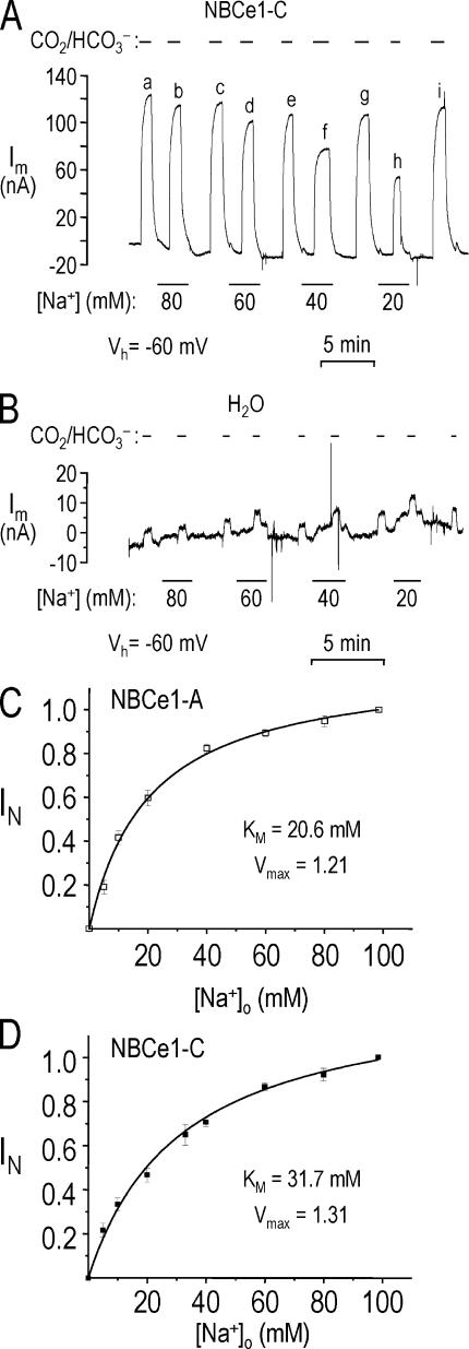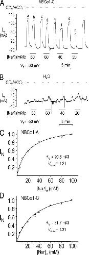 Figure 7. External Na+ dependencies of NBCe1-A and -C. (A) A voltage-clamped oocyte (Vh = −60 mV) expressing NBCe1-C was exposed to 5% CO2/33 mM HCO3− solutions containing different [Na+]s. (B) The experimental protocol used in A was performed on an H2O-injected oocyte. (C) Normalized HCO3−-induced currents as a function of external [Na+] for oocytes expressing NBCe1-A (r2 = 0.98). HCO3−-induced outward currents at different Na+ concentrations were normalized to the mean currents elicited by the flanking exposures to the 33 mM HCO3− solution containing “full” 98.5 mM Na+. (D) Normalized HCO3−-induced currents as a function of external [Na+] for oocytes expressing NBCe1-C (r2 = 0.97).
