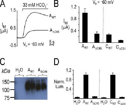 Figure 13. Reduced activity and low surface expression of AΔC46 and CΔC61 expressed in oocytes. (A) 5% CO2/33 mM HCO3− elicited an outward current in an oocyte expressing NBCe1-A (AWT) that was markedly larger than the current in the oocyte expressing AΔC46. (B) Summary of H2O-subtracted, HCO3−-induced currents from experiments similar to those shown in A. n ≥ 6 for each bar from two batches of oocytes. (C) Immunoblot analysis of total microsomal protein from single oocytes injected with H2O, AWT cRNA, or AΔC46 cRNA. An NBCe1 antibody labeled bands of the expected sizes: ∼130 kD for AWT and ∼120 kD for AΔC46. (D) The mean normalized luminescence (Norm. Lum.) for oocytes expressing the truncated NBCs were markedly less than the Norm. Lum. for oocytes expressing the corresponding wild-type NBCs. n ≥ 11 for each bar from two batches of oocytes.