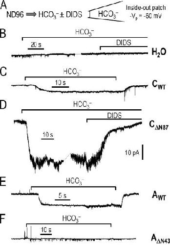 Figure 14. NBCe1 activity from inside-out macropatches excised from oocytes. (A) NBC-mediated inward currents were elicited by exposing patches to a low-Cl−, 5% CO2/33 mM HCO3− solution ± 200 μM DIDS with the patch pipette (−Vp = −60 mV) containing the same low-Cl−, 33 mM HCO3− solution. (B) H2O-injected oocyte. The HCO3− solution without or with DIDS did not elicit any change in current. (C) CWT-injected oocyte. The HCO3− solution elicited a small inward current that was reversible when the patch was returned to ND96. (D) CΔN87-injected oocyte. The inward current elicited by the HCO3− solution was larger than the current seen in C, and completely inhibited by DIDS. (E) AWT-injected oocyte. The HCO3− solution elicited a small, reversible inward current. (F) AΔN43-injected oocyte. No change in current was observed when the patch was exposed to HCO3−.