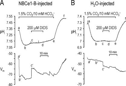 Figure 2. Activity of rat brain NBCe1-B expressed in an oocyte. (A) pHi (top trace) and voltage (bottom trace) were measured simultaneously in an NBCe1-B–injected oocyte that was initially bathed in a nominally HCO3−-free, HEPES-buffered solution. The oocyte was exposed to a solution containing 1.5% CO2/10 mM HCO3− during segment ae. Electrogenic NBC activity was evident from the instantaneous hyperpolarization (b'), and the pHi recovery (bc) following the initial CO2-induced acidification (ab). DIDS blocked the pHi recovery (cd), and partially reversed the hyperpolarization (c'). (B) The same experimental protocol in panel A was performed on an H2O-injected oocyte. Exposing the oocyte to CO2/HCO3− had no effect on Vm (a'b'), and elicited no pHi recovery (bc) following the initial decrease in pHi (ab). 200 μM DIDS generated only a small hyperpolarization (c').