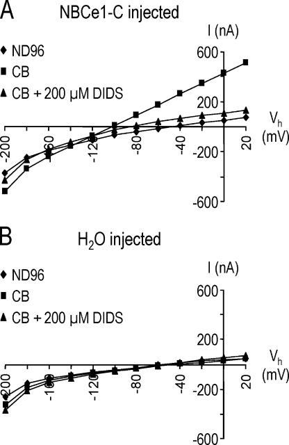 Figure 3. Current–voltage (I-V) relationship of NBCe1-C expressed in oocytes. (A) I-V plots were obtained from an NBCe1-C–expressing oocyte initially bathed in ND96 (diamonds), followed by 10 min in 5% CO2/33 mM HCO3− (CB) (squares), and then after 2 min in the CO2/HCO3− solution containing 200 μM DIDS (triangles). (B) The same experimental protocol in A was performed on an H2O-injected oocyte.