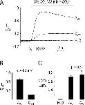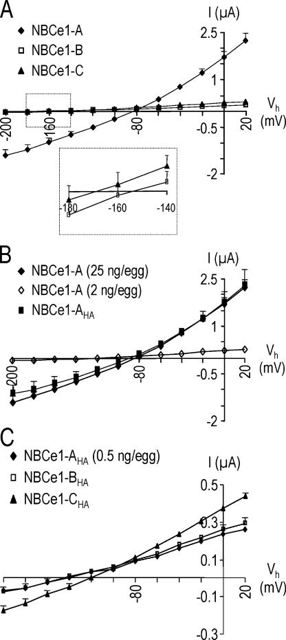 Figure 4. I-V relationships of the three NBCe1 variants. (A) HCO3−-dependent I-V plots were obtained from oocytes expressing NBCe1-A (closed diamonds), NBCe1-B (open squares), and NBCe1-C (closed triangles). For each data point, n ≥ 11. (Inset) The I-V plots are magnified near the reversal potentials (IM = 0) for NBCe1-B and C. (B) HCO3−-dependent I-V plots from oocytes injected with 25 ng of NBCe1-A cRNA (closed diamonds, redrawn from A), 2 ng of NBCe1-A cRNA (open diamonds, n = 3), or 25 ng of HA-tagged NBCe1-AHA cRNA (closed squares, n = 6). (C) HCO3−-dependent I-V plots from oocytes injected with 0.5 ng of NBCe1-AHA cRNA (closed diamonds, n = 3), 25 ng of NBCe1-BHA cRNA (open squares, n = 4), or 25 ng of NBCe1-CHA cRNA (closed triangles, n = 4). Error bars smaller than symbols are not shown.